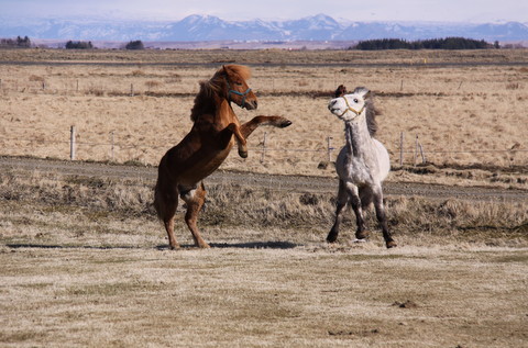 Eftir að meistaradeildin kláraðist hér var tími á að endurgjalda hestlánið. En Elvar á Skörðugili setti undir okkur hesta í skeiðinu svo Simbi fór norður til á taka þátt í slaktaumatöltinu þar. Það fór bara mjög vel, reyndar í gegnum B-úrslit en svo lá leiðin beint í 1. sætið. Elvar og Simbi fóru á kostum í A-úrslitunum. Við fórum norður til að sjá hesta og reiðmenn fyrir norðan og taka Simba með okkur heim í leiðinni. Simbi er í hörkuformi og virtist fara létt með að fara heim sama kvöldið. Næsta dag var sól og blíða og Simbi fékk að fara út í sólbaði, með herbergisfélaga sinum Matthíasi. Þeir brugðu á leik og fögnuðu heimkomunni og endurfundinum.