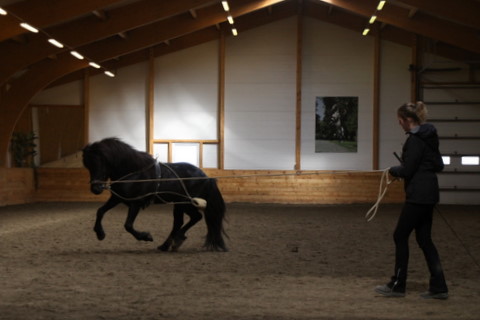 Það var að ljúka hjá okkur námskeið með Julio Borba, að venju var það fræðandi og skemmtilegt. Það er hægt að bæta endalaust, við erum alltaf að fá punkta, eitthvað sem virðist svo lítið en er samt mikilvægt. Í þetta sinn lögðum við áherslu á taumhringsvinnu á siðari hluta námskeiðsins, ss. hvernig á að þjálfa hvern einstakling fyrir sig á sem bestan hátt þegar við erum ekki á baki. Hægt er að framkvæma taumhringsvinnu á mismunandi hátt og er eins og fyrr segir er þetta í fyrsta sinn sem ég hef haft gaman af og séð nægan tilgang í þess háttar taumhringsvinnu. Það er alveg hreint ótrúlegt að sjá hverning maðurinn vinnur og hvaða áhrif hann getur haft á hestanna. Allt með sömu markmið og þegar við erum á baki. Sumir hestarnir unnu með hliðartaum, aðrir með taum sem kom upp ámilli framfótanna og svo var unnið með hið svokallaða "pesóa" sem var hannað af manni með sama nafn, en hann var frægur hindrunnarstökksknapi. Miðað var við að unnið væri á stökki með pesóa þó seinna meir væri og er unnið á brokki líka, en pesóa á að styrkja yfirlínuna og bæta stökk.