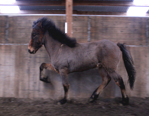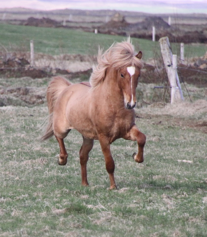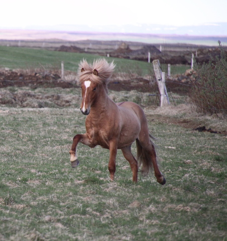 Vorum að fá senda þessa mynd frá Önnu Guðrúnu í www.fornhagi.is Hún er af Kvarani frá Fornhaga en hann er á fyrsta vetri undan Ljóna frá Ketilsstöðum og Hörku frá Akureyri. Harka er dóttir Örar frá Akureyri og Kjarki frá Egilsstaðabæ en Harka hlaut 8,13 í aðaleinkunn fimm vetra gömul með m.a 9,0 fyrir vilja og geðslag. Anna Guðrún lýsir Kvaran þanning " Hann er alver risastór, mikill sláni (á vonandi eftir að bæta kjöt á beinin) og fljúgandi gengur. Þetta folald á það til að taka fluga skeiðspretti þegar mikið liggur við en brúkar annars allan gang og fer mikið á tölti. Hann var heilrakaður í marsbyrjun þegar við tókum hann inn og er enn ekki farinn að fá sumarhárinn þannig að liturinn er hálf grámóskulegur ennþá. Hann er annars mjög fallega rauðjarpur á litinn, mikill kappi hann Kvaran."
